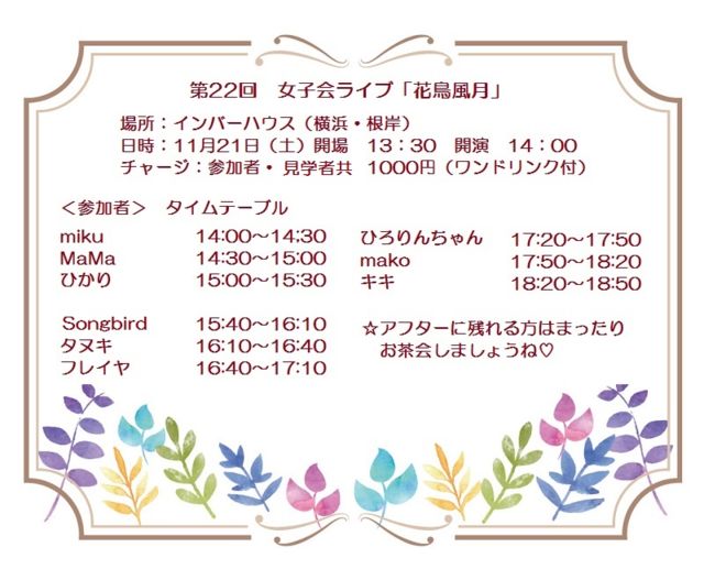 ËèÅÙ¤ªÆëÀ÷¤ß¤Î½÷»Ò²ñ¥é¥¤¥Ö¤Ç¤¹(^^)¡£ ¾ì½ê ¥¤¥ó¥Ð¡¼¥Ï¥¦¥¹(º¬´ß) Æü»þ 11·î21ÆüÅÚÍËÆü¡¡³«¾ì¡¡13:30 ³«±é¡¡14:00 ¥Á¥ã¡¼¥¸ (»²²ÃÈñ) 1000±ß(¥ï¥ó¥É¥ê¥ó¥¯ÉÕ¤) »²²Ã¤Î³§¤µ¤Þ ¥Õ¥ì¥¤¥ä miku ¤Ò¤í¤ê¤ó¤Á¤ã¤ó ¤ä¤Þ¤Á¤ã¤ó ¥¿¥Ì¥ mako MaMa ¤Ò¤«¤ê ¥¥ ¸«³Ø¤ÏÃ˽÷Ìä¤ï¤ºÂç´¿·Þ¤Ç¤¹(^^)¡£ ¤è¤í¤·¤¯¤ª´ê¤¤¤·¤Þ¤¹m(_ _)m¡£