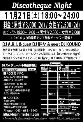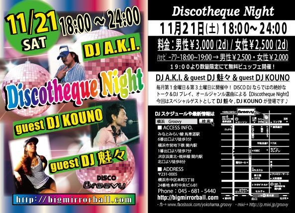 DISCO Groovy º£·î¤ÎÂè3ÅÚÍËÆü¤Ï¡ª¡ÚDJ A.K.I.¡Û¤Ë¤è¤ë¡ÔDiscotheque Night¡ÕDISCO DJ¤Ê¤é¤Ç¤Ï¤ÎÀä̯¤Ê¥È¡¼¥¯¡õDJ¥×¥ì¥¤¤Ë¤Æ²£ÉͤΥµ¥¿¥Ç¡¼¥Ê¥¤¥È¤òÀ¹¤ê¾å¤²¤Þ¤¹¡ªº£²ó¤Ï¡ÚDJ KOUNO¡õDJ Ì¥¡¹¡Û¤È¥²¥¹¥ÈDJ¤¬2̾¡ª³Ú¤·¤¯Æø¤ï¤¦°ìÌë¤òÀ§Èó¤´´®Ç½¤¯¤À¤µ¤¤¢ö ¡Ú²»³Ú¡Û¥ª¡¼¥ë¥¸¥ã¥ó¥ë Soul¡¢Funk¡¢Dance Classics¡¢R¡õB¡¢EDM¡¢etc... ¡Ú³«ºÅ»þ´Ö¡Û 18¡§00¡Á24¡§00 ¡Ú¥Ï¥Ã¥Ô¡¼¥¢¥ï¡¼ÎÁ¶â / 18:00¡Á19:00¤Ë¤´ÍèŹ¤ÎÊý¡Û ÃËÀ¡§¡ï2,500/2Drinks¡Ü¥Ó¥å¥Ã¥Õ¥§ÉÕ ½÷À¡§¡ï2,000/2Drinks¡Ü¥Ó¥å¥Ã¥Õ¥§ÉÕ ¡ÚÎÁ¶â / 19:00°Ê¹ß¤´ÍèŹ¤ÎÊý¡Û ÃËÀ¡§¡ï