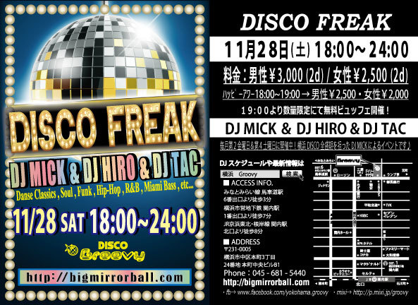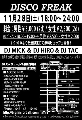 DISCO Groovy 11·î¤âÂè4ÅÚÍËÆü¤Ï¡ÚDISCO FREAK¡Û²£ÉÍDISCO¤ÎÁ´À¹´ü¤òô¤Ã¤¿DJ MICK¤Ë¤è¤ë¥¤¥Ù¥ó¥È¡ªº£²óDJ HIRO¡õ¥²¥¹¥ÈDJ TAC¤È¶¦¤ËÇ®¤¯¸ü¤¯·«¤ê¹¤²¤é¤ì¤ë¥×¥ì¥¤¤ò³§ÍͤÇÀ§È󤪳ڤ·¤ß²¼¤µ¤¤¢ö ¡Ú²»³Ú¡Û Danse Classics / Soul / Funk / Hip-Hop / R&B / Miami Bass etc... ¡Ú³«ºÅ»þ´Ö¡Û 18¡§00¡Á24¡§00 ¡Ú¥Ï¥Ã¥Ô¡¼¥¢¥ï¡¼ÎÁ¶â / 18:00¡Á19:00¤Ë¤´ÍèŹ¤ÎÊý¡Û ÃËÀ¡§¡ï2,500/2Drinks¡Ü¥Ó¥å¥Ã¥Õ¥§ÉÕ ½÷À¡§¡ï2,000/2Drinks¡Ü¥Ó¥å¥Ã¥Õ¥§ÉÕ ¡ÚÎÁ¶â / 19:00°Ê¹ß¤´ÍèŹ¤ÎÊý¡Û ÃËÀ¡§¡ï3,000/2Drinks¡Ü¥Ó¥å¥Ã¥Õ¥§ÉÕ ½÷À¡§¡ï2,500/2Drin