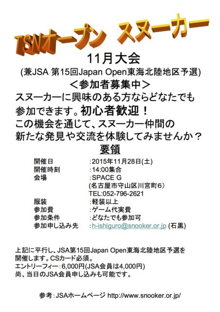 ²¼µ¤ÎÄ̤ꡢ³«ºÅ¤¤¤¿¤·¤Þ¤¹¤Î¤Ç¡¢¤ß¤Ê¤µ¤Þ¤Î¤´»²²Ã¤ªÂÔ¤Á¤·¤Æ¤ª¤ê¤Þ¤¹¡£ ¡ÚÍ×¹à ¡Û ³«ºÅÆü¡¡¡§11·î28Æü¡ÊÅÚ¡Ë ²ñ¾ì¡¡¡¡¡§SPACE-£Ç ¡¡¡¡¡¡¡¡¡¡Ì¾¸Å²°»Ô¼é»³¶èÀîµÜÄ®£¶ ¡¡¡¡¡¡¡¡¡¡052-796-2611¡¡¡¡¡¡¡¡¡¡¡¡¡¡¡¡ »þ¹ï¡¡¡¡¡§ 14»þ½¸¹ç ÉþÁõ¡¡¡¡¡§ ·ÚÁõ°Ê¾å¡Ê¥¸¡¼¥ó¥º¡¢£Ô¥·¥ã¥Ä¤ÏÉÔ²Ä¡Ë »²²Ã¿½¤·¹þ¤ßÀè¡§h-ishiguro@snooker.or.jp https://www.facebook.com/toukai.snooker/ º£·î¤ÏJSA¥¸¥ã¥Ñ¥ó¥ª¡¼¥×¥óÅ쳤ËÌΦÃ϶èͽÁª¤Ç¤¹¡£ ¡Ö¥¨¥ó¥È¥ê¡¼¥Õ¥£¡¼¡§\6,000¡ÊJSA²ñ°÷¤Ï\4,000¡Ë¡×¤Ë¤Ê¤ê¡¢ÅöÆü¤ÎJSA²ñ°÷¿½¤·¹þ¤ß¤â²Äǽ¤Ç¤¹¡£