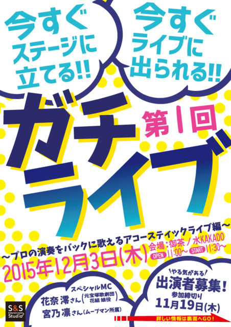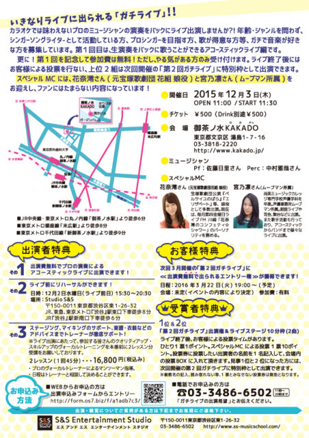 管理人様 突然の書き込み失礼いたします。 **** いきなりライブに出られるガチライブ!! **** 今すぐライブに出られる!! 今すぐステージに立てる!! 『第1回ガチライブ』 〜 プロの演奏をバックに歌えるアコースティックライブ編 〜 カラオケでは味わえないクオリティの高い生演奏をバックに ライブ出演しませんか?! 年齢・ジャンルを問わず、シンガーソングライタ-として活動している方、プロシンガーを目指す方、 歌が得意な方等、ガチで音楽が好きな方を募集しています。 第1回目は、プロミュージシャンの演