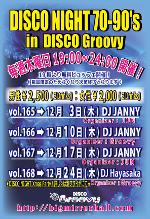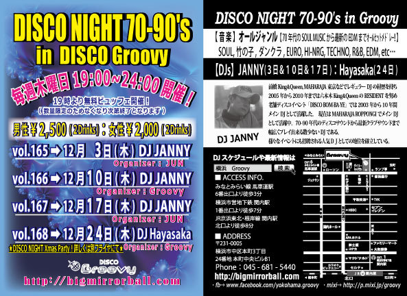 【おなじみGroovyのディスコナイト】70年代のSOULミュージックから最新のEDMまでオールヒットメドレー!踊れる曲盛り沢山でお贈りします♬ 【オーガナイザー】JUN 【DJ】JANNY(MAHARAJA ROPPONGI) 【音楽】ALL GENRE (SOUL、竹の子、ダンクラ、EURO、HI-NRG、TECHNO、R&B、EDM、etc…) 【開催時間】 19:00〜24:00 【料金】 男性:¥2,500/2Drinks+ビュッフェ付 女性:¥2,000/2Drinks+ビュッフェ付 (ビュッフェは19時よりご用意しますが数量限定につき無くなり次第終了となります)
