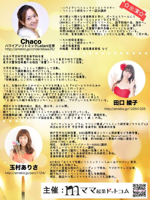 12月3日のクリスマスコンサート!! 手作り楽器工作があるので、 ママと一緒に作ったミニ楽器を使って、そのままコンサートに参加しましょう〜♪ お子様自身が音を出し、演奏に参加できるので、 「音楽って楽しい〜♪」と感じる時間になりますよ☆ 今回のコンサートには、 3人の大人気講師が出演してくださることになりました! ★ハワイアンリトミックLeilani主宰Chaco先生 http://ameblo.jp/cinderellaaa35/ ★即興リトミック講師/うたのおねえさん・田口綾子先生 http://ameblo.jp/1225t1225 ★マリンバ奏者・玉村ありさ