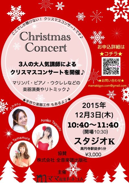 12月3日(木)に高円寺で、クリスマスコンサートを開催します! 今回のコンサートには、 3人の大人気講師が出演してくださることになりました! ★予約が取りにくい!ハワイアンリトミック教室レイラニ主宰 Chaco先生 http://ameblo.jp/cinderellaaa35/ ★即興リトミック講師&うたのおねえさん♪ 田口綾子先生 http://ameblo.jp/1225t1225 ★雑誌やTVでママモデルとしても活躍!マリンバ奏者 玉村ありさ先生 http://ameblo.jp/perc1124/ 豪華3人のコンサートです! マリンバ・ピアノ・ウクレレ、そのほかの楽