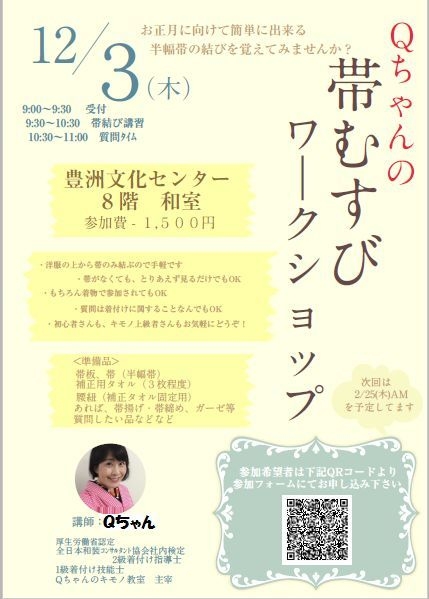 管理人様、みな様お邪魔いたします。 Qちゃんのキモノ教室です。 12月3日に豊洲文化センターにて 帯むすびワークショップを開催いたします。 洋服の上に帯だけ結んでも もちろん、着物を着ていらして ばっちりお稽古しても また、見てメモ取るだけでも なんでもOKです。 受講料は1,500円 お申し込みは、こちら http://goo.gl/forms/7RGPrv8cxL または下記QRコードより アクセスお申し込み下さい。 詳しくは下記ブログをご覧下さいませ。 http://plaza.rakuten.co.jp/qchankimono/diary/20151111000
