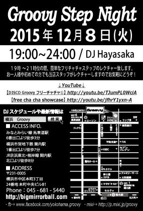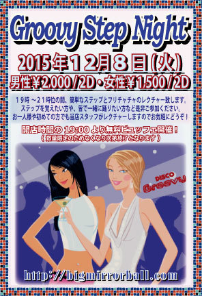 第2・第4の火曜日は【Groovy STEP NIGHT】19時〜21時位の間、簡単なステップとフリチャチャのレクチャーあります! 初心者の方、お一人様でも、当店スタッフがご対応させて頂きますのでどうぞお気軽にご参加ください♪ 【DJ】Hayasaka 【音楽】ALL MIX (21時位からは通常のDISCO TIMEになります。リクエストにも出来る限りお応えいたしますのでDJまでどうぞ♪) 【開催時間】 19:00〜24:00 【料金】 男性:¥2,000/2Drinks+ビュッフェ 女性:¥1,500/2Drinks+ビュッフェ (ビュッフェは19時よりご用意致しますが数量限定のため