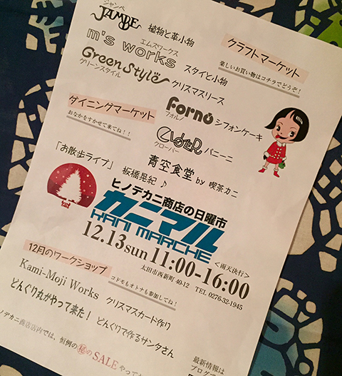 ********************************** 管理人さま 貴重なスペースをお借りして、大変ありがとうございます。 不適切な内容と判断されました場合、お手数ですが削除お願い致します。 ********************* ************* 太田市のヒノデカニ商店からのお知らせです。 恒例の『カニマルシェ』を開催致します♪ << 12月の蟹マル出店者 >> クラフトマーケット:::::::::::::::::::::::::::::::::::::::::::::::::::::::::::::