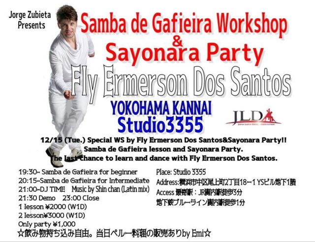 Special WS by Fly Ermerson Dos Santos ¡õ Sayonara Party!! £±£²·î£±£µÆü ²ÐÍËÆü Ãæ¹ñ¤Ë³èưµòÅÀ¤ò¤ª¤¯¡¢Fly Ermerson ¤ÎÍèÆü¤Ëȼ¤¤¡¢ZOUK¤äSamba de Gafieira¤Î ¥ï¡¼¥¯¥·¥ç¥Ã¥×¤ò³«ºÅÃæ¤Ç¤¹ º£²ó¤ÏÃæ¹ñ¤Ç¥Ö¥é¥¸¥ê¥¢¥ó¥Ú¥¢¥À¥ó¥¹¤Î¿¶¶½¤ËÅØ¤á¤ëÈà¤ÎÅìµþÂçºå¥¤¥Ù¥ó¥È¥Ä¥¢¡¼¤Î ºÇ½ªÆü¤Ç¤¹ Workshop¤Î¸å¤Ï Sayonara Party DJ¤·¤ó¤Á¤ã¤ó ¤Î¥é¥Æ¥ó¥ß¥Ã¥¯¥¹¤Ë¤Æ³Æ¥¸¥ã¥ó¥ëÍÙ¤ì¤Þ¤¹ ³§¤µ¤ó¤Ç¸òή¡õ³Ú¤·¤¤»þ´Ö¤ò¤ª²á¤´¤·¤¯¤À¤µ¤¤¡ª ²ñ¾ì¤Ï²£ÉÍ´ØÆâ¤ÎÏ·ÊÞ¥µ¥ë¥µ¥¯¥é¥Ö£³£³£µ£µ EmiQuita¤Ë¤è¤ë¥Ú¥ë¡¼ÎÁÍý¡¢¥Ö¥é¥¸¥ëÎÁÍý¡¢¥«¥¯¥Æ¥ë