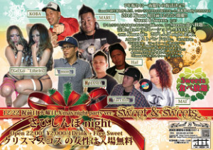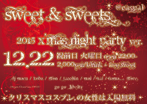 2015/12/22 ½ËÁ°Æü ²ÐÍËÆü Sweet & Sweets 2015 Final -X'mas night party ver.- Open 22:00- 2,000yen/1Drink + Free Sweet ¥¯¥ê¥¹¥Þ¥¹¥³¥¹ ¤Î½÷À¤ÏÆþ¾ì̵ÎÁ -R&B ¡Ä- -DJ- MARU KOBA mon Tacchin MAI Hal HAMA -Go Go- Libelty 7ǯ¿¶¤ê¤Ë°ìÌë¸Â¤ê¤ÎÉü³è·èÄê!! Casual¤ÎÁÏÀ¸´ü¤òºî¤ê¾å¤²¡¢¤¤¤í¤¤¤í¤ÊEVENT¤ÎÇÉÀ¸¤È¤Ê¤Ã¤¿ R&B only EVENT S&S 2015 X'mas ½ËÆüÁ°12/22¤Ë³«ºÅ!! ¡ÖSweet & Sweets¡×¤È¤Ï? ´Å¤¯¤È¤í¤±¤ë¤è¤¦¤ÊR&B¤òÃæ¿´¤ËDJ¤¬Áª¶Ê¤·¤Ê¤¬¤é¡¢´Å¤¤Sweets¤ò¿©¤ÙÊüÂê¤È¤¤¤¦ ²»³Ú¤È¿©¤ò¥³¥é¥Ü¥ì¡¼¥·¥ç¥ó¤·¤¿EVENT¡£ º£²ó