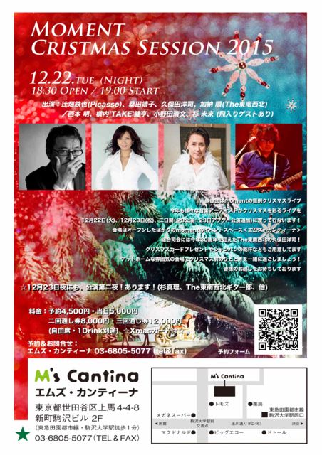 ¡ãMoment Christmas Session 2015¡ä ±ÇÁüÃÄÂÎmoment¤Î¹±Î㥯¥ê¥¹¥Þ¥¹¥é¥¤¥Ö¡£º£Ç¯¤âÍÍ¡¹¤Ê²»³Ú¥¢¡¼¥Æ¥£¥¹¥È¤¬¥¯¥ê¥¹¥Þ¥¹¤òºÌ¤ë¥é¥¤¥Ö¤ò¡¢12·î22Æü(²Ð)¡¢12·î23Æü(½Ë)¡¢ÆóÆü´Ö(Á´3¸ø±é¡ù23Æü¥¢¥Õ¥¿¡¼¸ø±éÄɲÃ)¤ËÅϤäƹԤʤ¤¤Þ¤¹¡£²ñ¾ì¤Ï¥ª¡¼¥×¥ó¤·¤¿¤Ð¤«¤ê¤Îmoment¤Î¥¤¥Ù¥ó¥È¥¹¥Ú¡¼¥¹¡ã¥¨¥à¥º¡¦¥«¥ó¥Æ¥£¡¼¥Ê¡ä¡£»Ê²ñ¤Ë¤Ïº£Ç¯30¼þǯ¤ò·Þ¤¨¤¿TheÅìÆîÀ¾Ë̤ε×ÊÝÅÄÍλʡ£¥¯¥ê¥¹¥Þ¥¹¥«¡¼¥É¥×¥ì¥¼¥ó¥È¤ä¥·¥ã¥ó¥Ñ¥ó¤Î´¥Çդʤɤ⤴ÍѰդ·¤Æ¤Þ¤¹¡£¥¢¥Ã¥È¥Û¡¼¥à¤ÊÊ·°Ïµ¤¤Î²ñ¾ì¤Ç¥¯¥ê¥¹¥Þ¥¹Á°¤Î¤Ò¤È¤È¤¤ò°ì½ï¤Ë²á¤´¤·¤Þ¤·¤ç¤¦¡£³§ÍͤΤª±Û¤·¤ò¤ªÂÔ¤Á¤·¤Æ¤ª¤ê¤Þ