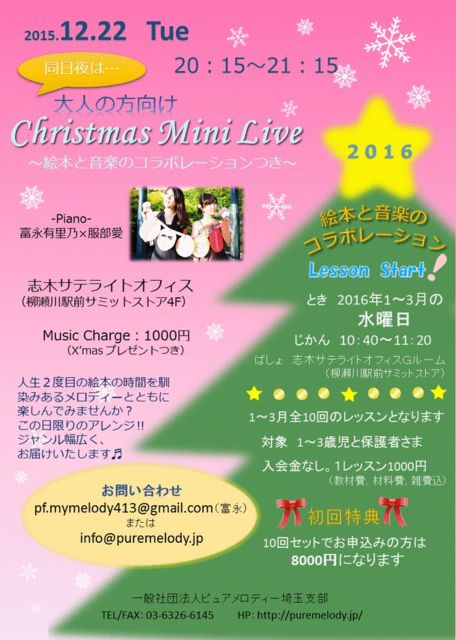 µ®½Å¤Ê¥¹¥Ú¡¼¥¹¡¢¼ºÎ餤¤¿¤·¤Þ¤¹¡£ ¥Ô¥¢¥Î¥Ç¥å¥ª¤Ë¤è¤ë¡¢ ³¨ËܤȲ»³Ú¤Î¥³¥é¥Ü¥ì¡¼¥·¥ç¥ó ¡ÁChristmas Mini Live¡Á ¤Î¤ªÃΤ餻¤ò¤µ¤»¤Æ¤¤¤¿¤À¤¤Þ¤¹¢ö 2015.12.22¡Ê²Ð¡Ë 20:15-21:15 »ÖÌÚ¥µ¥Æ¥é¥¤¥È¥ª¥Õ¥£¥¹¤Ë¤Æ ¡ÊÅìÉðÅì¾åÀþÌøÀ¥Àî±ØÁ°¥µ¥ß¥Ã¥È4³¬¡Ë »²²ÃÈñ 1000±ß¡Ê¥×¥ì¥¼¥ó¥È¤Ä¤¡Ë ¤ª»Å»öµ¢¤ê¤Ë¡¢¤´Í§¿Í¤ä¤´É×ÉØ¤Ç¡¢¡¢¡¢ ¤Õ¤é¤ê¤È¤ªÎ©¤Á´ó¤ê¤¤¤¿¤À¤±¤ë¾ì½ê¤Ç¤¹¡£ Live¡ª¤È¤¤¤¦²ñ¾ì¤Ç¤Ï¤¢¤ê¤Þ¤»¤ó¤¬¡¢¡¢¡¢ Christmas»þ´ü¤Î²»³Ú¤ò¤Û¤Ã¤ÈϤ䤫¤Ë³Ú¤·¤ó¤Ç¤¤¤¿¤À¤±¤ë¡¢¥¢¥Ã¥È¥Û¡¼¥à¤Ê¶õ´Ö¤ò¤ªÆÏ¤±¤¤¤¿