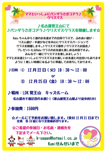 ̾¸Å²°¡¡LDK Kakuozan³Ð²¦»³¡Á¤Þ¤Á¤Î¥Ä¥ê¡¼¥Ï¥¦¥¹¡Á¥¥Ã¥º¥ë¡¼¥à¤Ë¤Æ ¢ö¥Ñ¥ó¥À¤¦¤µ¤®¥³¥¢¥é¢ö¥¯¥ê¥¹¥Þ¥¹¥¯¥é¥¹¤ò³«ºÅ¤·¤Þ¤¹¡ù Baby¤Á¤ã¤ó¤«¤é2ºÐ¤Î¤ªÍ§Ã£¤Þ¤Ç¤Î¹çƱ¥¯¥é¥¹¤Ç¡¢¤Õ¤ì¤¢¤¤Í·¤Ó¡¦ ¥ê¥º¥àÍ·¤Ó¡¦¼êÍ·¤Ó¤Ê¤É¤òÃæ¿´¤Ë¥¯¥ê¥¹¥Þ¥¹¥Ð¡¼¥¸¥ç¥ó¤Ç ¥¯¥é¥¹¤ò³«ºÅ¤·¤Þ¤¹¡£¢ö¥¯¥ê¥¹¥Þ¥¹À½ºî¢ö¥¯¥ê¥¹¥Þ¥¹¤ªÏòñ¢ö ¥×¥ì¥¼¥ó¥È¤â¡ùBaby¥¯¥é¥¹¤Î¤ªÍ§Ã£¤â³Ú¤·¤á¤ëÆâÍÆ¤Ç¤¹¤è¡£ ¤ß¤ó¤Ê¤Ç°ì½ï¤Ë¥¯¥ê¥¹¥Þ¥¹¤ò³Ú¤·¤ß¤Þ¤·¤ç¤¦¡ª ¥Þ¥Þ¤È¤ªÍ§Ã£¤È¤¤¤Ã¤·¤ç¤Ë¥¯¥ê¥¹¥Þ¥¹¤Þ¤¿¿·¤·¤¤¤ªÍ§Ã£¤È¤Î½Ð²ñ¤¤¤â¤¢¤ê¤Þ¤¹¤è¤¦¤Ë¡ª ³Ú¤·¤¤»þ´Ö¤Ë¤Ê¤ë¤è¤¦¤Ë½àÈ÷¤·¤Æ¤ªÂÔ¤Á¤·