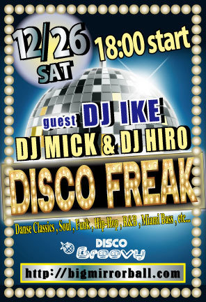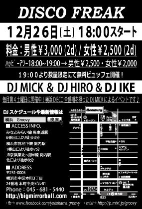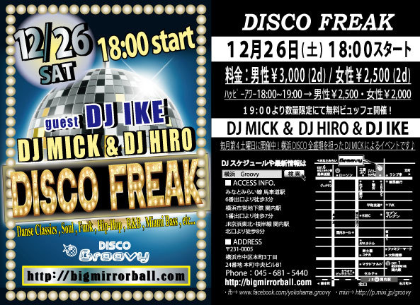 DISCO Groovy 12·î¤âÂè4ÅÚÍËÆü¤Ï¡ª¡ÚDISCO FREAK¡Û²£ÉÍDISCO¤ÎÁ´À¹´ü¤òô¤Ã¤¿DJ MICK¤Ë¤è¤ë¥¤¥Ù¥ó¥È¡ªº£²óDJ HIRO¡õ¥²¥¹¥ÈDJ IKE¤È¶¦¤ËÇ®¤¯¸ü¤¯·«¤ê¹¤²¤é¤ì¤ë¥×¥ì¥¤¤ò³§ÍͤÇÀ§È󤪳ڤ·¤ß²¼¤µ¤¤¢ö ¡Ú²»³Ú¡Û Danse Classics / Soul / Funk / Hip-Hop / R&B / Miami Bass etc... ¡Ú³«ºÅ»þ´Ö¡Û 18¡§00¥¹¥¿¡¼¥È ¡Ú¥Ï¥Ã¥Ô¡¼¥¢¥ï¡¼ÎÁ¶â / 18:00¡Á19:00¤Ë¤´ÍèŹ¤ÎÊý¡Û ÃËÀ¡§¡ï2,500/2Drinks¡Ü¥Ó¥å¥Ã¥Õ¥§ÉÕ ½÷À¡§¡ï2,000/2Drinks¡Ü¥Ó¥å¥Ã¥Õ¥§ÉÕ ¡ÚÎÁ¶â / 19:00°Ê¹ß¤´ÍèŹ¤ÎÊý¡Û ÃËÀ¡§¡ï3,000/2Drinks¡Ü¥Ó¥å¥Ã¥Õ¥§ÉÕ ½÷À¡§¡ï2,500/2Dri