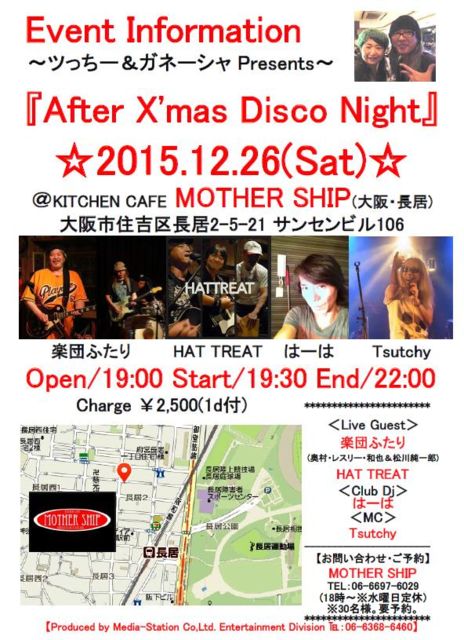 HAT TREAT 今年最後のライブです ツっちー&ガネーシャPresents 『After X'mas Disco Night』 日時:12月26日(土) 19:00オープン 19:30スタート 場所:「MOTHER SHIP」 大阪市住吉区長居2-5-21 サンセイビル106 TEL:06-6697-6029 出演者:楽団ふたり HAT TREAT はーは Tsutchy チャージ:2500円(1drink付)