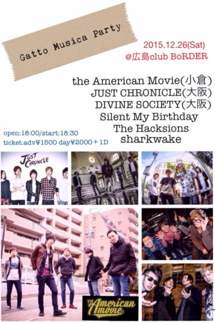 ■12.26(土) 広島club BoRDER 「Gatto Musica Party」 OPEN 18:00 START 18:30 ADV ¥1,500 BDV ¥2,000(+1 drink order) w/JUST CHRONICLE, DIVINE SOCIETY, Silent My Birthday, The Hacksions, sharkwake