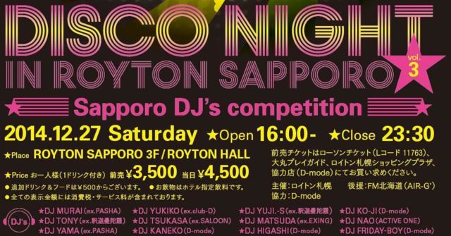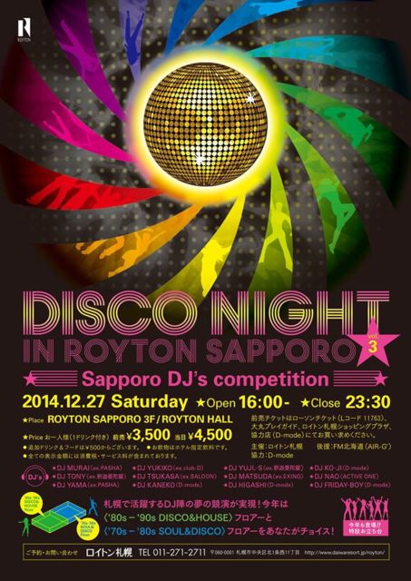 º£Ç¯3²óÌܤò·Þ¤¨¤ëǯËöºÇÂç¤Î¥Ç¥£¥¹¥³¡¦¥¤¥Ù¥ó¥È¡ÈRoyton DISCO NIGHT ¡É º£²ó¤Ï¡¢¡ÈDJ¡Çs competition¡É ¤ÈÂꤷ¤Æ¡¢»¥ËڤdzèÌö¤¹¤ë¥¹¥¿¡¼DJ¿Ø¤é¤Î¶¥±é¤¬¼Â¸½¡ª¡ª ¡ÈDISCO & HOUSE¡É¥Õ¥í¥¢¤È¡ÈSOUL & DISCO¡É¥Õ¥í¥¢¡¢2²ñ¾ì¤ò¤¢¤Ê¤¿¤¬¥Á¥ç¥¤¥¹¡ª ºÇ¿·¥ô¥£¥¸¥å¥¢¥ë¡õ¥é¥¤¥Æ¥£¥ó¥°¤ò¶î»È¤·¤¿¡¢NEO-DISCO-STYLE¤ÎÈ󸽼¶õ´Ö¤ò¤ª³Ú¤·¤ß¤¯