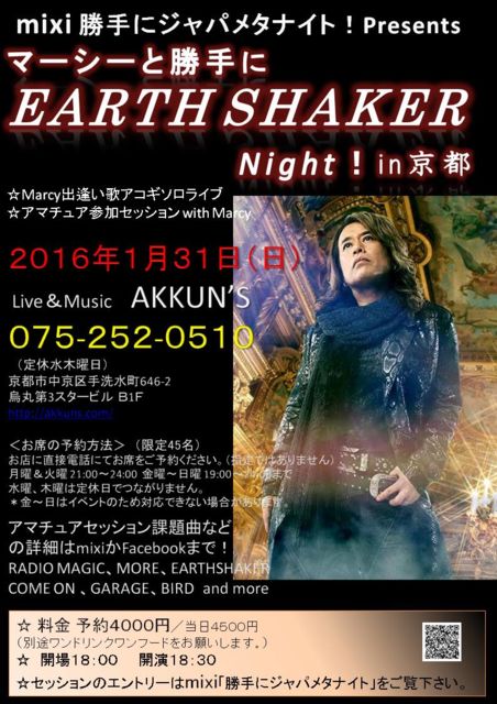 ¾¡¼ê¤Ë¥¸¥ã¥Ñ¥á¥¿¥Ê¥¤¥È¡ªpresents¡¡ ¡Ø¥Þ¡¼¥·¡¼¤È¾¡¼ê¤ËEARTH SHAKER Night¡ªin µþÅÔ¡Ù ³«ºÅ·èÄꡪ ¥¢¥Þ¥Á¥å¥¢»²²ÃEARTH SHAKER¥»¥Ã¥·¥ç¥ówith ¥Þ¡¼¥·¡¼ EARTH SHAKER¤Î¥Þ¡¼¥·¡¼¤È¶¦±é¤Ç¤¤ëÌ´¤Î¤è¤¦¤Ê¥Á¥ã¥ó¥¹¡ª ¤³¤ì¤Ïƨ¤¹¤Ê¡ª ¤â¤Á¤í¤ó³Ú´ï¤ò¥×¥ì¥¤¤·¤Ê¤¤¸«¤ë¤À¤±¤ÎÊý¤â£Ï£Ë¡ª ¡úµþÅÔ³«ºÅ¡¡2016ǯ£±·î£³£±Æü¡ÊÆü¡Ë ¡úLive¡õMusic AKKUN¡ÇS¡Ê¸ÂÄê45̾¡Ë ¡¡http://www.akkuns.com/ ¡¡µþÅÔ»ÔÃæµþ¶è¼êÀö¿åÄ®646-2 ±¨´ÝÂè3¥¹¥¿¡¼¥Ó¥ë £Â1£Æ ¡¡¡ÊÄêµÙ¿åÌÚÍËÆü¡¡19»þ¡Á24»þ¡Ë ¡ú£°£·£µ¡¾£²£µ£²¡¾£°£µ£±£°¡¡ ¡úͽÌó¡¡£´£°£°£°±ß¡¿ÅöÆü