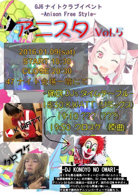 -----------------------------ナイト裏企画!----------------------------------- 今年も痛板民による、アニソンを流してフリースタイルに楽しむアニクライベント、アニスタを行います!! DJは各地で活動している痛板乗りを集め、機材もこの日の為に、タイヤサイズのスピーカーをDIYをして組みました! 今年のナイトイベントは、メインフロアとアンダーなフロアで、雪山音楽フェスのような感覚で楽しんで行きましょう!! ----------------------------------------------------------------------------- 2015/12/20 23:59 3次募