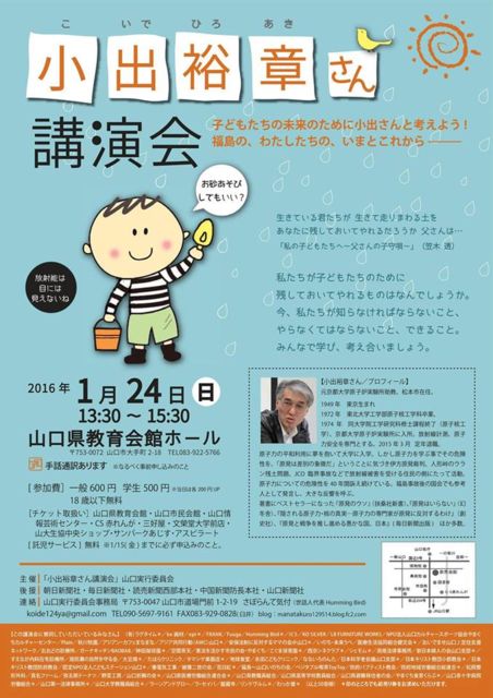 日時:2016年1月24日(日)13:30〜15:30 会場:山口県教育会館ホール 参加費:一般600円 学生500円 (当日はいずれも200円UP) 18歳未満無料。 手話通訳あり:なるべく事前に予約のこと 託児サービス:無料。1/15日(金)までに要予約。 プレイガイド:山口情報芸術センター・アスピラート・サンパークあじす ほかに協賛団体の店などで販売。 主催:「小出裕章さん講演会」山口実行委員会 連絡:TEL090-5697-9161・FAX083-929-0828(臼井) koide124ya@gmail.com 1月24日 小出裕章さんが山口に来られます。山口市で講演会 -