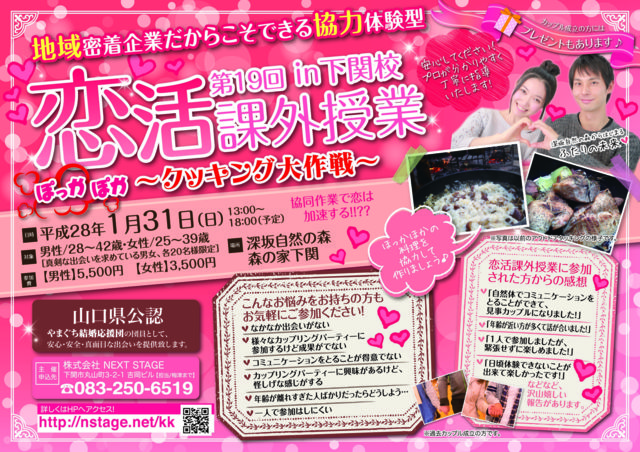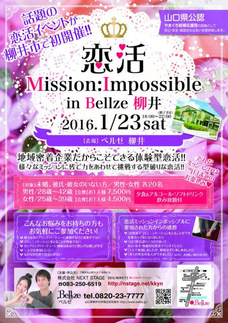 ◆ 新春指令発令中! 協力体験型 恋活ミッション インポッシブル INベルゼ柳井 ◆ 受付中 主催者 株式会社 NEXT STAGE 実施日時 平成28年1月23日(土曜日) 18:00〜22:00 内容 2016年のスタートです!!新年を新しい出会いでスタートしましょう。 皆さん、『2016年の抱負はきまりましたか??』『スタートダッシュを決めましょう!!』 ★今年こそは素敵な出逢いが欲しい! ★新年からみんなでワイワイ したい!★ なんか予感がする!★何事も最初が肝心だ! 地域密着企業だからこそでき