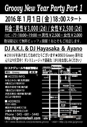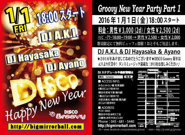 ¡úA HAPPY NEW YEAR¡ª2016¡ú ¡Á¤¢¤±¤Þ¤·¤Æ¤ª¤á¤Ç¤È¤¦¤´¤¶¤¤¤Þ¤¹¡Á DISCO Groovy¤Ï¸µÃ¶¤è¤ê±Ä¶È¡ªÂ裱¶âÍËÆü¤Îº£²ó¤Ï¡ÚDJ A.K.I.¡õDJ Hayasaka¡õDJ Ayano¡ÛDISCO DJ¤Ê¤é¤Ç¤Ï¤ÎÀä̯¤Ê¥È¡¼¥¯¡õDJ¥×¥ì¥¤¤Ë¤Æ²£ÉͤθµÆüÌë¤òÀ¹¤ê¾å¤²¤Þ¤¹¡ù ¡Ú²»³Ú¡Û¥ª¡¼¥ë¥¸¥ã¥ó¥ë Soul¡¢Funk¡¢Dance Classics¡¢R¡õB¡¢EDM¡¢Euro¡¢etc... ¡Ú³«ºÅ»þ´Ö¡Û 18¡§00¥¹¥¿¡¼¥È ¡Ú¥Ï¥Ã¥Ô¡¼¥¢¥ï¡¼ÎÁ¶â / 18:00¡Á19:00¤Ë¤´ÍèŹ¤ÎÊý¡Û ÃËÀ¡§¡ï2,500/2Drinks¡Ü¥Ó¥å¥Ã¥Õ¥§¡¢¤ª¤È¤½ÉÕ ½÷À¡§¡ï2,000/2Drinks¡Ü¥Ó¥å¥Ã¥Õ¥§¡¢¤ª¤È¤½ÉÕ ¡ÚÎÁ¶â / 19:00°Ê¹ß¤´ÍèŹ¤ÎÊý¡Û ÃË