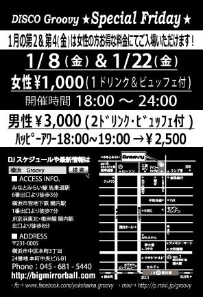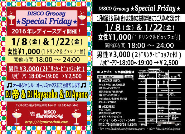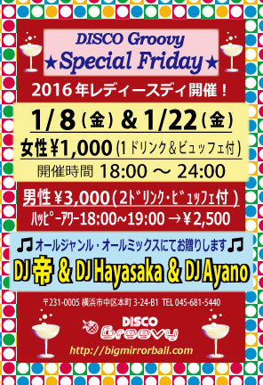 1月の第2&第4金曜日は!女性のお客様とってもお得な料金にてご入場いただけるスペシャルなフライデー♪ 現在横浜のクラブシーンを熱く賑わすDJ 帝(mikado)のプレイを是非ご堪能ください☆ 【女性料金】 ¥1,000 / 1Drink+ビュッフェ付 【開催時間】 18:00〜24:00 【DJ's】 帝 / Hayasaka / Ayano 【音楽】オールジャンル・1970〜2016オールミックス Danse Classics / Soul / Funk / Hip-Hop / R&B / EDM / etc... 【男性ハッピーアワー料金 / 18:00〜19:00ご来店の方】 ¥2,500 / 2Drinks+ビュッフェ付 【男性料金 /