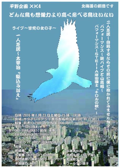 Ë̳¤Æ»¤«¤é¤¤Þ¤·¤¿¡ª Ê¿Ìî´ë²è¡ß£Ë4 ¡Ö¤É¤ó¤ÊÄ»¤âÁÛÁüÎϤè¤ê¹â¤¯Èô¤Ù¤ëÄ»¤Ï¤¤¤Ê¤¤¡× Æü»þ 2016ǯ1·î23ÆüÅÚÍËÆü ²ñ¾ì ¥µ¥Ö¥Æ¥ì¥Ë¥¢¥ó(ÅìµþÅÔÈͶ¶èɹÀîÄ®46¤Î4B1) ÎÁ¶â Á°Çä¤ê2500±ß¡¢ÅöÆü·ô3000±ß Á°È¾ 14:30³«¾ì 15:00¡Ä¡Ä¥é¥¤¥Ö¡Á´ÅÅޤν÷¤Î»Ò¡Á 15:25¡Ä¡ÄÆó¿Í¼Çµï¡Á¼«»¦¤¹¤ë¤Ê¤é¤½¤ÎÁ°¤ËËͤËÊú¤«¤ì¤Æ¤ß¤Þ¤»¤ó¤«¡©¡Á 16:30¡Ä¡Ä°ì¿Í¼Çµï¡ÁÂÀºË¼£¡Ø¶î¹þ¤ßÁʤ¨¡Ù¡Á 17:05¡Ä¡Ä¥Ñ¥Õ¥©¡¼¥Þ¥ó¥¹¡ÁÅ´¥Ñ¥¤¥×¤È»³¹â˹¡Á 17:20¡Ä¡Ä±éÌܽªÎ» 18:00ÊÄ¾ì ¸åȾ 18:30³«¾ì 19:00¡Ä¡Ä¥é¥¤¥Ö¡Á´ÅÅޤν÷¤Î»Ò¡Á 19:25¡Ä¡ÄÆó¿Í¼Çµï¡Á¼«»¦¤¹¤ë¤Ê