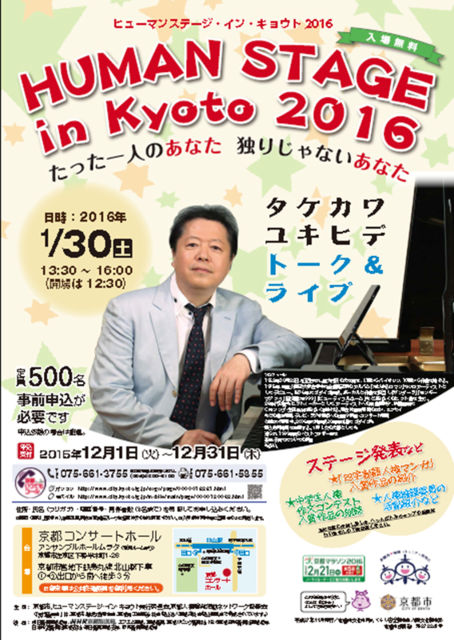 ヒューマンステージ・イン・キョウト2016 会場 京都コンサートホール アンサンブルホールムラタ 時間 開場 12:30 開演13:30 料金 入場無料 (要事前申込・定員500名) 出演 タケカワユキヒデ、各入賞者 http://miyakomanabi.jp/search/?act=detail&id=4337&r=1450310004.8937 お問合せ 文化市民局 くらし安全推進部 人権文化推進課 (TEL: 075-366-0322) http://www.city.kyoto.lg.jp/bunshi/page/0000190674.html