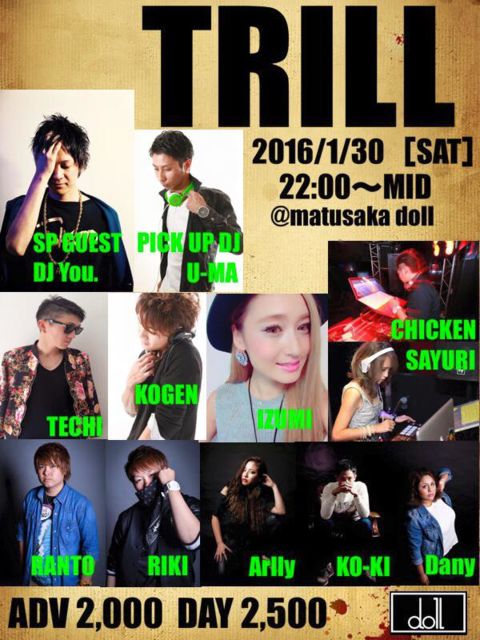 ALL GENRE MIX PARTY TRILL 2016.1.30 @松阪 doll 22:00〜MID ADV 2,000 DAY 2,500 CAST DJ KOGEN DJ CHICKEN DJ Dany DJ KO-KI DJ Arlly DJ RIKI DJ IZUMI DJ TECHI DJ SAYURI DJ RANTO PICK UP DJ DJ U-MA GUEST DJ DJ You.