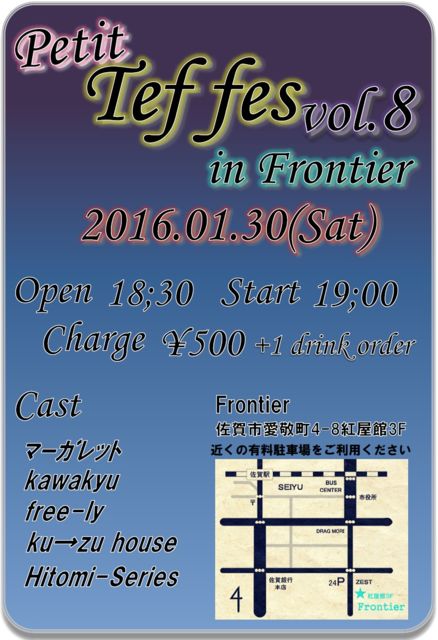 平成28年1月30日(土) 場所 Frontier(佐賀市愛敬町) 開場 18:30 開演 19:00〜 料金 500円+要1ドリンクオーダー 今回はアコースティックのグループが多くて、ぷちteffesらしくゆったりしたライブになりそうです! また、Teftefイベント初参加の方も出演されるのでぜひご来場ください!! 出演料・ノルマ・キャッシュバック なし タイムテーブル 17:00 リハーサル 19:00〜19:20 マーガレット 19:35〜19:55 kawakyu 20:05〜20:25 free-ly 20:35〜20:55 ku→zu house 21