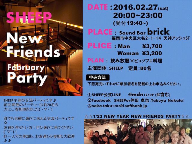 本日開催(((o(*゚▽゚*)o))) ==================== SHEEP New Friends Party 2/27(土)20:00〜23:00(受付19:40〜) 会場:brick(大名) ==================== 交流イベントサークルSHEEP主催! 純粋に『友達』を作りたい♫と思う方が集まる定期的に開催している交流イベントです(^^) お一人での参加も友達との参加も大歓迎です☆★ 開催直前まで申し込みお待ちしてます! 遅れての参加も可です☆★ ============== 現在申し込み状況 ============== 申し込み人数:約55人 参加年齢層:20代前半〜30代後半 男女比率: 約