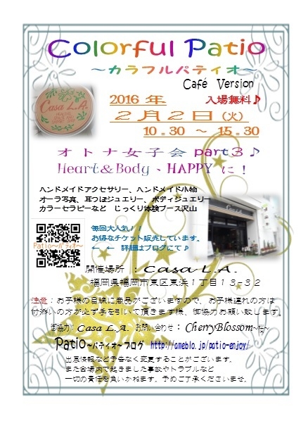 今回、福岡市東区にありますCasa.L.A.様より ご協力を頂きまして Colorful Patio〜カラフルパティオ〜を開催致します。 Colorful Patio〜カラフルパティオ〜 *CaféVersion* 2016年 2月 2日(火) 10:30〜15:30 場所:Casa.L.A. Caféスペース コンセプトは女子会♪ ココロとカラダの栄養補給しませんか? ハンドメイドほか、ボディケア、カラーセラピーなど ご準備してお待ちしています! お得なチケットをご用意しています。 当日3ブース体験&お食事付きで1000