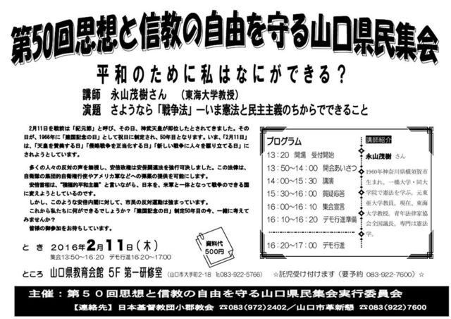 ÌÀÆü¡¢»³¸ý»Ô¤Ç³«ºÅ¤µ¤ì¤ë¡ÖÂ裵£°²ó»×Áۤȿ®¶µ¤Î¼«Í³¤ò¼é¤ë»³¸ý¸©Ì±½¸²ñ¡×¤Î¤ªÃΤ餻 Æü»þ¡§£²·î£±£±Æü¡ÊÌÚ¡Ë£±£³»þ£µ£°Ê¬¤è¤ê ¾ì½ê¡§»³¸ý»Ô¶µ°é²ñ´Û£µFÂè°ì¸¦½¤¼¼ ¹Ö»Õ¡§±Ê»³Ìмù¤µ¤ó¡ÊÅ쳤Âç³Ø¶µ¼ø¡Ë ±éÂê¡§¤µ¤è¤¦¤Ê¤é¡ÖÀïÁèË¡¡×¡¼¤¤¤Þ·ûË¡¤È̱¼ç¼çµÁ¤Î¤Á¤«¤é¤Ç¤Ç¤¤ë¤³¤È »ñÎÁÂå¡§£µ£°£°±ß ¤ß¤Ê¤µ¤ó¡¢Í§Ã£¤È¤´°ì½ï¤Ë¤´»²²Ã¤¯¤À¤µ¤¤¡£ ¾ÜºÙ¤Ï¡¢¥Á¥é¥·¤ò¤´Í÷²¼¤µ¤¤¡£ https://www.facebook.com/syunnzi.matubayasi/posts/997172447028567