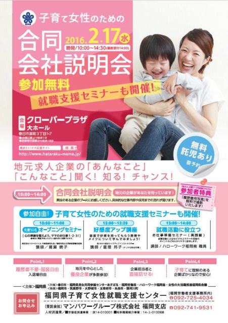 《働きたいママ応援イベント 参加者募集中》 今年度最後の 子育て女性のための 合同会社説明会&就職支援セミナーを 春日にて開催します。 就職支援セミナー、好感度アップ講座〜メイク術〜コーナーあり♪ 子育て中の女性が働きやすい地元企業が多数出展。 直接お話ができるチャンスです。 また、合同会社説明会で3社以上、 企業ブースを訪問された方限定で 「履歴書用写真」を無料で撮影します! 参加費無料! お子さま連れで参加OK! 履歴書不要、スーツ等も不要です。 ぜひ、お越しください! ★春日会場★ 《日時》