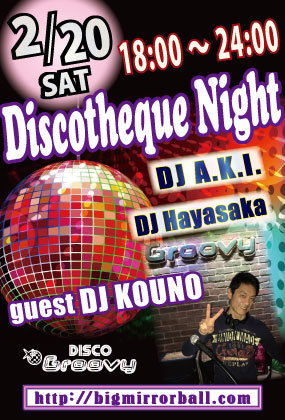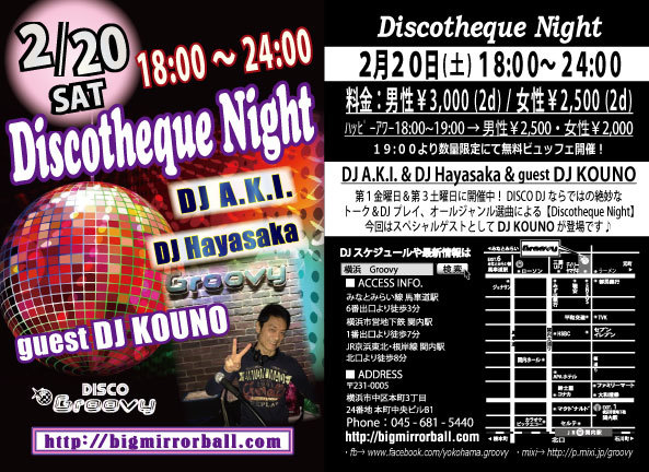 DISCO Groovy 2·î¤âÂè3ÅÚÍËÆü¤Ï¡ª¡ÚDJ A.K.I.¡Û¤Ë¤è¤ë¡ÔDiscotheque Night¡ÕDISCO DJ¤Ê¤é¤Ç¤Ï¤ÎÀä̯¤Ê¥È¡¼¥¯¡õDJ¥×¥ì¥¤¤Ë¤Æ²£ÉͤΥµ¥¿¥Ç¡¼¥Ê¥¤¥È¤òÀ¹¤ê¾å¤²¤Þ¤¹¡ªº£²ó¤Ï¡ÚDJ KOUNO¡Û¤¬¥²¥¹¥È½Ð±é¡ª³Ú¤·¤¯Æø¤ï¤¦°ìÌë¤ò³§ÍͤÇÀ§Èó¤´´®Ç½¤¯¤À¤µ¤¤¡ù ¡Ú²»³Ú¡Û¥ª¡¼¥ë¥¸¥ã¥ó¥ë Soul¡¢Funk¡¢Dance Classics¡¢R¡õB¡¢EDM¡¢etc... ¡Ú³«ºÅ»þ´Ö¡Û 18¡§00¡Á24¡§00 ¡Ú¥Ï¥Ã¥Ô¡¼¥¢¥ï¡¼ÎÁ¶â / 18:00¡Á19:00¤Ë¤´ÍèŹ¤ÎÊý¡Û ÃËÀ¡§¡ï2,500/2Drinks¡Ü¥Ó¥å¥Ã¥Õ¥§ÉÕ ½÷À¡§¡ï2,000/2Drinks¡Ü¥Ó¥å¥Ã¥Õ¥§ÉÕ ¡ÚÎÁ¶â / 19:00°Ê¹ß¤´ÍèŹ¤ÎÊý¡Û ÃËÀ¡§¡ï3,000/2
