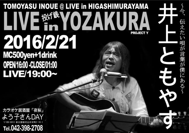 「井上ともやす」が樹よう子の熱いエールにこたえ夜桜にやってきます。 2/14に発売のニューアルバムをひっさげ熱いライブが期待できます。 当日はNO-PA、NO−マイクで生の音を満喫してください。 オリジナルを中心にちょこっと拓郎さんも歌っていただく予定です。 2016年2月21日(日) 開場/16:00 ライブ(投げ銭)は19;00〜 MC/500円+ワンドリンクオーダー
