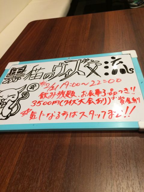 イベント名 黒猫のウィズ交流会(リアルクイズ王は誰だ) 開催日 2月21日19時〜21時 開催店舗 アニメ&ソーシャルゲームBAROVER(たこ焼き味穂のビルの2階 アメソンスクエアビル2階にあります) 開催場所 大阪市中央区西心斎橋2-8-33 アメソンスクエアビル2階-N 最寄り駅 各線心斎橋駅下車徒歩5分 各線難波駅下車徒歩3分 参加服装 自由(お気に入りの服装で来て下さい) 参加費用 男性3500円 女性3500円 (飲み放題+食べ物3品) (クイズ大会賞金あり) 支払い方法 当日、現地受付にて 参加年齢18歳以上 参加人数12名 詳細 アル