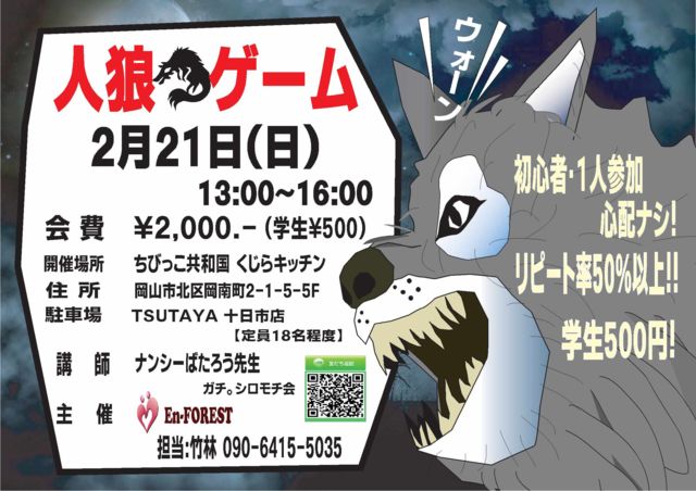 ❦❦❦ 人狼ゲーム 2月開催のご案内 ❦❦❦ 人狼ゲーム告知です。2月は1回のみの開催です。 毎回、初心者・1人参加の方に多数参加してもらってます。 我々と一緒に人狼ゲームを楽しみましょう♬ 日時:2月21日(日) 13:00〜 場所:くじらキッチン 岡山市北区岡南町2-1-5-5F 定員:18名程度 参加費:2,000円.※学生500円 ◎初心者・1人参加 心配ナシ! ◎リピート率50%以上!! ◎学生割引あり(学生は参加費500円) ※イベントは完全予約制です。 お申し込み