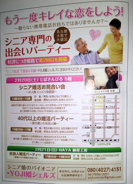 昨年末、じばさんびるにてX'masナイト婚活パーティーを開催させて頂きました、【・YOJI婚シェルズ】企画の姫路第2弾パーティーです。 前回はクリスマスイヴイヴにも関わらず満員御礼を頂きました。今回の会場は納屋工房(イーグレ姫路西隣)にて開催させて頂きます。 姫路城を眺めながらの婚活パーティー。もうすぐもうすぐです、幸せの花を持って姫路にお伺いします。 キレイな恋を探されてる方は是非、お越し下さい。 2月21日17時30分開始 【参加資格】 男性・女性 25歳〜30代の社会人の方 【参加費】 男性4,500円