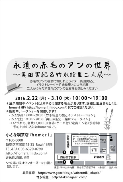 『永遠の赤毛のアン展 〜奥田実紀&竹永絵里2人展〜』 2016年2月22日(月)〜3月10日(木) プリンス・エドワード島に暮らし、アンやPEI関連の書籍を出している奥田実紀と、イラストレーター竹永絵里とのコラボ展です! 本、イラスト、写真……満載です! 場所:小さな喫茶店homeri(東京都新宿区三栄町25−33Bowビル2階) http://homeri.jimdo.com/ 丸ノ内線「四谷三丁目」駅下車、4番出口より徒歩3分 10:00〜19:00 日・祝休み *カフェのためワンオーダーをお願いいたします。 「旅とイラストレーシ