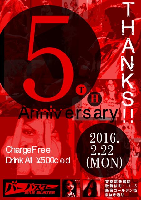 おかげさまでバーバスターでは2月22日をもって、創業5周年を迎えます。ありがとうございます。 つきましては、5周年記念パーティーを開催しますので、ぜひご参加ください。 当日はチャージフリー、全品500円(シャンパン除く)、キャッシュオンデリバリーになります。 立ち飲みにご協力ください。 よろしくお願いします。