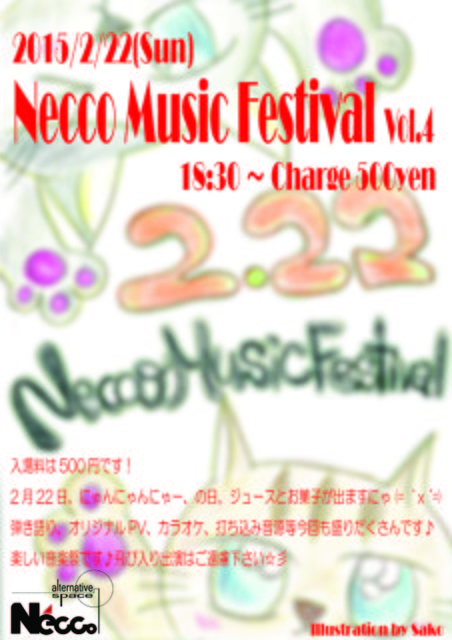 開催日時 2015年2月22日(日) 18:30〜21:30 開催場所 Alternative Space Necco 東京都新宿区西早稲田2-18-21 ハシバビル2階 参加費:500円(お菓子・ドリンク付) 2月22日(日)Necco Music Festival Vol.4を開催します。 チャージは500円。お菓子、ドリンク付きです。 18:30よりスタートです。 観覧者は予約不要です。出演者は締め切りました。 技術、経験不問の音楽祭です! よろしくお願いします。 18:35-18:45 TM Necco Work 「BE TOGETHER」「Get wild」(TM Network) にゃんまげ Vo 坂本 Vo 岡田 AirKey & DTM 18:45-