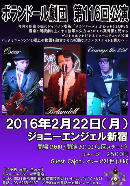 第116回公演のお知らせです。 ボランドール氏のTwitterからの無断転載です。 ----- 明日 ! 新宿ジョニーエンジェルにてボランドール劇団単独公演! 20時頃から2回ステージ!チャージ2500円! 新物語は間に合うのか?! アコースティックバージョンでしっとりとかつ情熱的にお届けいたします! -----