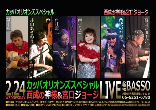 カッパオリオンズスペシャル×西成の神様 2月24日(水)  心斎橋BASSO         開場18:30 開演20:00  前売り2500円 当日3000円(ドリンク別) 出演: カッパオリオンズスペシャル  【ぱずを(G&Vo)井山あきのり(Pf)石井康二(Ba)南ルミコ(Vo&cho) 】      西成の神様×宮口ジョージ 心斎橋 BASSO 大阪市中央区東心斎橋1-6-20          TEL:06-6251-678 http://www.amem