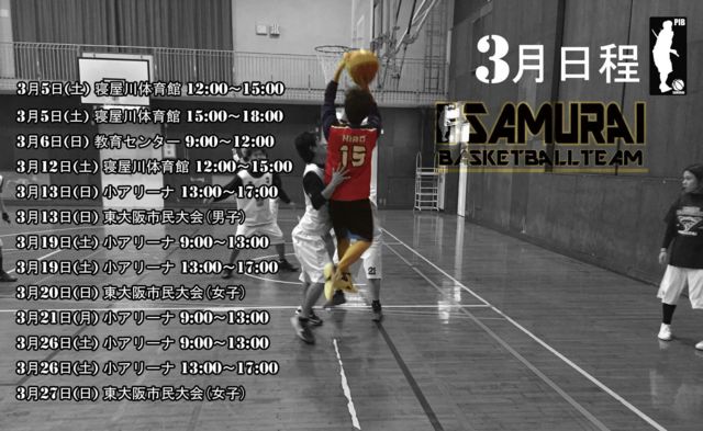 募集参加者 一般的なルールを守れる18歳以上(高校生不可)バスケ経験者(3年程度以上)男女。 活動内容 デジタルタイマーを使用し公式ルールでゲームしてます。 ランシュー等〜男女別ゲーム(10分Q間1分繰り返し)人数が少ない場合はミックス。 参加費 一部に付き1人500円 女子初回無料 諸注意 ※諸事情により開催が急遽変更になる場合がございますので参加前に掲示板を確認してください。 ※各回の募集は開催日の1週間前より行っております。 サムライ杯および練習試合、チーム練習の日はゲストプレーヤーの募集はありません