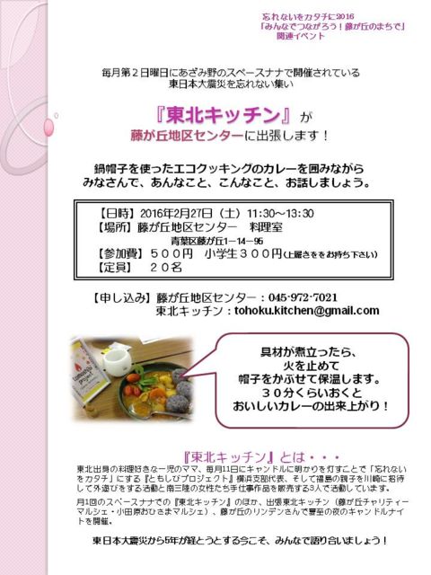3月13日(日)に、藤が丘駅前公園で開催される「忘れないをカタチに2016」チャリティーマルシェの関連イベントとして、2月27日(土)〜3月20日(日)の期間、藤が丘地区センターの展示ブースで、『被災地を知ろう』の資料展示が開催されます。 そのオープニングイベントとして、毎月第2日曜日に、あざみ野の「スペース ナナ」さんで開催されている『東北キッチン』が藤が丘に出張して来てくれます! 鍋帽子を使ったエコクッキングのカレーを囲みながら、皆さんであんなこと、こんなこと、お話ししましょう。 【3.11を忘れない『東北キッチン』@藤が丘地
