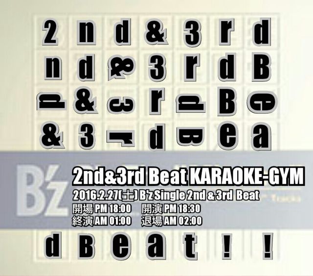 B'z BAR Brotherhood'z 2·î¥¤¥Ù¥ó¥È ¡ÈB'z 2nd¡õ3rd beat KARAOKE Night-GYM¡É 2nd¡õ3rd¤Î¤ß¤ò²Î¤¦¥³¥¢¤ÊÌë¤Ë¤·¤¿¤¤¤È»×¤¤¤Þ¤¹(^-^)/ ²Î¤¤¤¿¤¤Êý!! ²Î¤¦¤Î¤¬¹¥¤­¤ÊÊý!! ¿Í¤¬²Î¤Ã¤Æ¤¤¤ë¤Î¤òʹ¤¯¤Î¤¬¹¥¤­¤ÊÊý!! ¤ª°ì¿ÍÍÍ¡¢½éÍèŹ¡¢½é»²²Ã¡¢Æ±È¼OkayÂç´¿·Þ('-^*)b ¤¼¤Ò²Î¤Î¤ª·»¤µ¤ó¡¢¤ª»Ð¤µ¤ó¤Ë¤Ê¤Ã¤Æ¤¯¤À¤µ¤¤(¾Ð) ¤ª¹¥¤­¤Ê»þ´Ö¤ËÍè¤ÆÄº¤­¡¢¤ª¹¥¤­¤Ê»þ´Ö¤Ëµ¢TAKÂð!! ¡ÚÆü»þ¡Û 2016.2.27(ÅÚ) ³«¾ì PM 18:00 ³«±é PM 18:30 ½ª±é AM 01:00 Âà¾ì AM 02:00 ¡Ú¥³¡¼¥¹À©¡Û ¡ÔSinger(²Î¤¤¼ê) ŽºŽ°Ž½¡Õ ¡¦2,500±ß ¡¦¥ï¥ó¥É