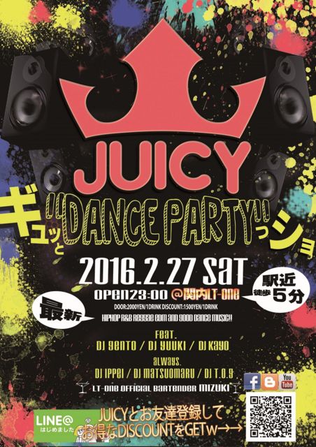 27ÆüÂè4ÅÚÍËÆü¤ÏJUICY³«ºÅ¡ª¡ª ³«ºÅ¾ì½ê¤Î´ØÆâLT¡¾ONE¤¬º£·î¤«¤é ¥ê¥Ë¥å¡¼¥¢¥ë¥ª¡¼¥×¥ó¤È¤¤¤¦¤³¤È¤Ç Í·¤Ó¤ËÍè¤Æ¤Ï¤¤¤«¤¬¤Ç¤·¤ç¤¦¤«¡£ ¤¼¤ÒJUICY¤ÇÍÙ¤êÌÀ¤«¤·¤Þ¤·¤ç¢ö ¡ú´ØÆâ±Ø¤«¤éLT-ONE¤Ø¤Î¹Ô¤­Êýư²è¤Ï¤³¤Á¤é¢­ http://youtu.be/3vOaffgtsrQ INFOMATION ¡ù2·î27ÆüÂè4ÅÚÍËÆü ¡úOPEN23:00¡Á ¡ù Æþ¾ìÎÁ¶â DOOR:2000±ß/1DRINK DISCOUNT:1500±ß/1DRINK ¢ªLINE¥¢¥«¥¦¥ó¥È:@rqs2560h ¤«¤éͧãÄɲäÇDISCOUNTÅÐÏ¿ ¤Ç¤­¤Á¤ã¤¤¤Þ¤¹¢ö¢ö ¡ö²èÌÌÄ󼨤ò¥¨¥ó¥È¥é¥ó¥¹¤Ë¤Æ¡ö ¡úVIPROOM:¤ª1¿ÍÍÍ1000±ß ¡ù ³Ø³ä¤â¤Ç¤­¤Þ¤·¤¿¢ö PLACE:´ØÆâLT-O