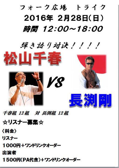 ¢£2016.2.28 (Æü) ¡¡¿¹ ¹á¡¡ÃƤ¸ì¤ê¥é¥¤¥Ö ¡¡¡¡¢¨O.A. ¸µÅÄ ÍÛ¼þ ¡¡OPEN 16:30¡¿START 17:00¡¡¡ï2,000