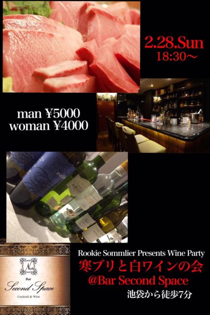 今年最初に開催した寒ブリと白ワインの会が、参加できなかった方々からの熱い熱いご要望を頂き、今回再び開催することになりました! 今年最後になるであろう旬の寒ブリと厳選し続けたワインを是非是非ご堪能ください! 今回は池袋にあるショットバー、セカンドスペースをお借りします! お店の席数の関係もあるので、今回は定員を15名とさせて頂きます。 皆さん是非是非ご参加ください! ・・・・・・・・・・・・・・・・・ 日時:2/28 18:30~20:30 場所:バー セカンドスペース 池袋から徒歩7分 会費:男性\5000 女性\400